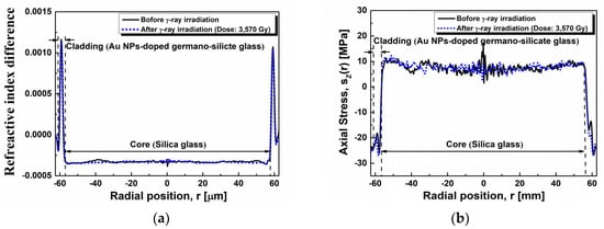(a) Refractive index difference and (b) stress profile of the fiber before and after the γ-ray irradiation with the dose rate of 3570 Gy.