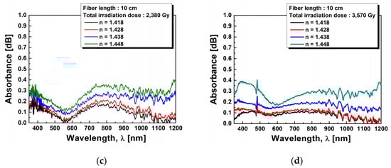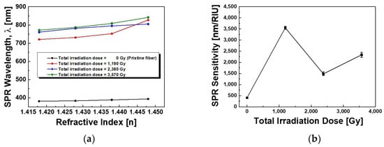 After the γ-ray irradiation, the SPR sensitivity increased rapidly but saturated with the increase of the total dose of γ-ray irradiation. The baseline corrected SPR band intensity slightly increased from 0.17 dB to 0.24 dB, from 0.17 dB to 0.18 dB, and from 0.07 dB to 0.11 dB with the increase of the refractive index from 1.418 to 1.448 at the total dose of 1190 Gy, 2380 Gy, and 3570 Gy, respectively. The increase of the SPR intensity with the increase of the refractive indices, regardless of the γ-ray irradiation, is due to a leak of more divergent light beams from the cladding of the fiber [,,]. However, as the total dose of γ-ray irradiation increased from 1190 Gy to 3570 Gy, the SPR band intensity decreased regardless of the corresponding refractive indices due to the increase of the radiation-induced loss as shown in Figure 6c. And the FWHM of the SPR band became broadened from 230.93 nm to 313.49 nm, from 277.47 nm to 278.52 nm, and from 240.48 nm to 260.96 nm with the increase of the refractive index from 1.418 to 1.448 at the total dose of 1190 Gy, 2380 Gy, and 3570 Gy, respectively. The broadened SPR band with the increase of the refractive indices regardless of the γ-ray irradiation is due to the spatial spreading and scattering of the conduction electrons and the FWHM of the SPR band was saturated with the increase of the total dose of γ-ray irradiation as shown in Figure 6d [,,]. Note that the center wavelength, intensity, and the FWHM of the SPR band were rapidly changed after the γ-ray irradiation at the total dose of 1190 Gy as compared with the fiber before the γ-ray irradiation. However, the change in center wavelength, intensity, and the FWHM of the SPR band was saturated as the total dose of γ-ray irradiation of 2380 Gy and 3570 Gy increased regardless of the corresponding refractive indices.