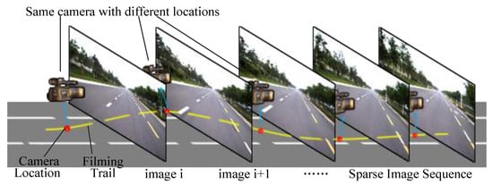 3D Road Environment Representation: Road scene simulation and modeling based on vehicle sensors are currently an important research topic in the field of intelligent transportation systems [,,,]. Most current image compositing approaches treat 3D road environment representation as a 2D problem, such as Photoshop. As described by Lalonde et al. [], we agree with their point of view that any image manipulation must be done in the 3D space of the scene, not in the 2D space of the image. But it is a pity that Lalonde et al. did not precisely define and describe that 3D space of scene. We believe that the three-dimensional road environment is a data field containing image data, spatial topology data, and motion data. Generated novel scene video visualizes these data. As shown in Figure 2, the reference road scene is represented by a sparse ordered image sequence containing data of real filming location of viewpoints. Recent advances in camera calibration, 3D registration, and scene reconstruction have allowed the synthesis of not only images and videos, but also the data of spatial topology. In this paper, we use the GPS coordinates of both viewpoint and virtual vehicles to compute the transformation parameters and open-source software OSM2World to transform a map description exported from OpenStreetMap into a mesh model of road surface. To restrict the motion range of virtual vehicle to the road area and simplify coordinate transformation, we defined a “corridor model” and applied triangle collision detection based on Irrlicht engine [,,].