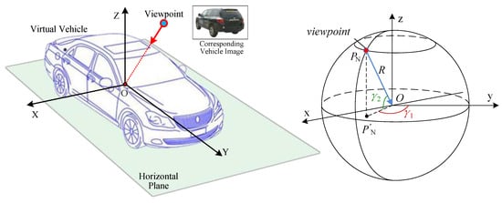 In the 3D vehicle model combined with multi-viewpoints, the distance between the viewpoint and the center of virtual vehicle varies with different viewpoints. For ease of management, we normalize all the viewpoints onto a spherical surface. The center of sphere coincides with the center of virtual vehicle. The spherical radius is R. Figure 4 shows the normalized viewpoint sphere. Each viewpoint lies on the sphere equidistant from the center is denoted by two variables, that is PN = (γ1, γ2).