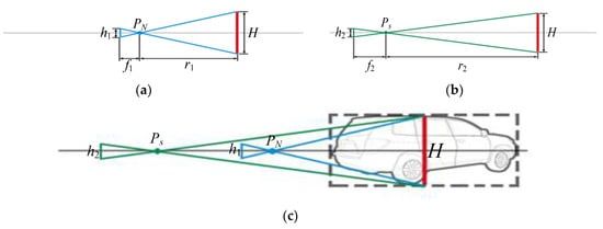 View space of vehicle model computation with scale factor using pin-hole model. (a) Pin-hole model at the viewpoint of PN which lies on normalized spherical surface; (b) pin-hole model at the viewpoint of Ps which is in the 3D space of road scene; (c) overlapping the optical axis in (a) and (b), the scaling relation is clear.