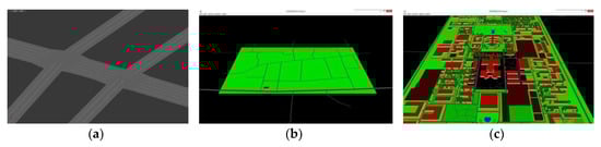 Three kinds of road model built from geographic information system (GIS) data. (a) Roads with details such as lanes and intersections; (b) roads in a region (data captured from suburb of Xi’an, China); (c) model with information besides of road (data captured from Xi’an Jiaotong University, Xi’an, China).