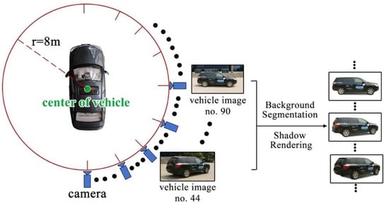 Since the acquisition of vehicle image in all viewpoints is unavailable, we discretely capture the image of unmanned vehicle at different viewpoints, as shown in Figure 12. We chose a large square plane without occlusion. The camera moved through a circle centered at the center point of vehicle. The distance between the camera and center of vehicle is 8 m. The height of camera above the ground is 1.8 m, which is the same as the height of camera capturing real road scene videos. We captured one image every other 1°, and obtained a set of 359 images in all. Each image is 2048 × 1536 pixels. Subsequently, we removed the background and rendered shadows manually to obtain a new set of vehicle images in different viewpoints. The new set of vehicle images is indexed by γ1 and γ2. The index is organized in the form of hash table to achieve quick load of vehicle images.