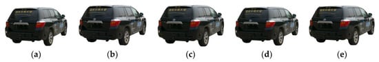 Vehicle image interpolation. (a) Image captured at 22°; (b) image captured at 24°; (c) image interpolated at 22.5°; (d) image interpolated at 23°; (e) image interpolated at 23.5°.