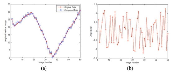 Calculation results of angle. (a) Comparison result. The blue line is original data and the red line is our result. (b) The error of angle is less than 1.2° and the average error is 0.6°.