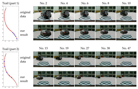 An image, the new location coordinate and orientation of the car model were recorded after the car model had been moved to a new place. Thus, we collect 60 groups of images and location data. The location data is used by our approach to compute relevant parameters. Figure 15 and Figure 16 show the comparison results of our algorithm and original data.