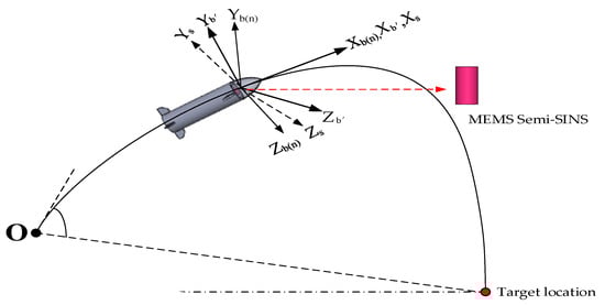 Firstly, the SINS is a traditional fixed connection structure which makes the MEMS sensors of the inertial navigation system inevitably sensitive to the effects of vibrations from the missile. Secondly, in the highly dynamic missile-borne environment, the missile’s angular rate in the roll axis is very large, resulting in the gyro measurement accuracy being sharply reduced. In an attempt to solve the above two problems and further realize high-precision measurement of the attitude of missiles, the concept of semi-strapdown INS (SSINS) was proposed by the Key Laboratory of Instrumentation Science and Dynamic Measurement [,]. In contrast to SINS, miniature inertial measurement unit (MIMU) in the SSINS is not rigidly attached to the missile but is connected to the carrier via the rotating mechanism, which provides a stable low-dynamic environment for SSINS and eliminates the interference of high-speed rotation with sensor accuracy. Therefore, gyros with small range can be used to measure missile attitude information in a relatively stable environment. For the above reasons, we chose SSINS in this work to measure the velocity, position and attitude information of the missile.