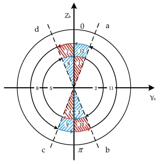 In order to simplify the analysis, here we assume that the value of the acceleration during the acceleration and deceleration process are the same and furthermore , meaning and . 7, 8, 9, 10, 11, and 12 are a counter-clockwise rotation process; the motion of 1, 2, 3, 4, 5, and 6 is also a clockwise rotation process, but in the opposite direction.