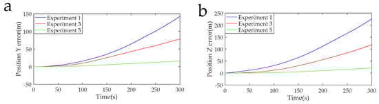(a) Position Y error curves of the Experiments 1, 3, and 5. (b) Position Z error curves of the Experiments 1, 3, and 5.