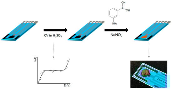 To the treated electrode, 20 μL of 0.4 M 3-aminophenylboronic acid and 20 μL of 0.4 M NaNO2 both diluted in 0.1 M H2SO4 were added to the working electrode. The reaction was left for 10 min, after which the electrode was washed exhaustively in a large volume of ultrapure water. The scheme presented in Figure 1 describes the steps to prepare the proposed glucose sensor.