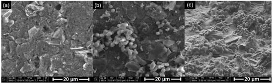 SEM images of the SPCE before and after the functionalization were recorded to verify the presence of the deposited boronic acid. Figure 2 shows that the bare electrode contained irregularly flaked graphite particles randomly distributed along the inhomogeneous surface of the carbon ink as also observed in the literature [,]. Following the incubation with the boronic acid, the transducer electrode was covered with clusters of circular shaped particles dispersed mainly around the graphite flakes.