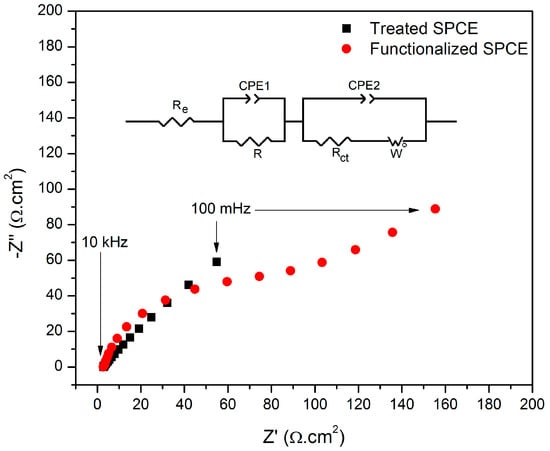 EIS was performed to investigate the changes in the electrochemical behavior of the SPCE due to the functionalization. The test was carried out at an AC amplitude of 0.01 V around the open circuit potential (OCP), which was previously stabilized for 300 s, with a frequency range varying from 10,000 to 0.1 Hz. Five points per frequency decade were recorded.