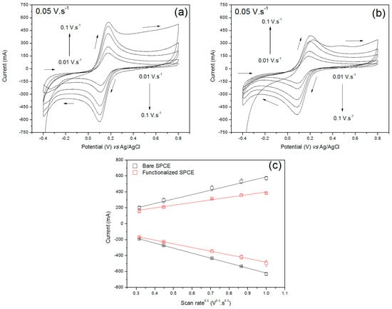 Cyclic voltammograms related to the bare (a) and functionalized (b) SPCE under different scan rates (0.1, 0.075, 0.05, 0.02 and 0.01 mV·s−1) in 0.1 M KCl + 5 mM Fe(CN)63-/4- and the relationship between the anodic/cathodic current peaks of the redox species at the electrodes and the square root of corresponding scan rates (c).