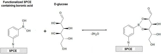 Scheme of the binding process between the boronic acid immobilized on the SPCE surface and the D-glucose molecule.