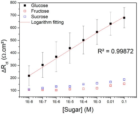 The equivalent circuit previously described was employed to fit the experimental data related to the glucose detection. The variation of the Rct from the modeling (ΔRct) was used to plot the calibration curve shown in Figure 7. The ΔRct value represents the difference of Rct from the sensor after and before its exposure to the different concentrated sugar solutions. It is evident the increase of ΔRct upon the exposition of the sensor to glucose at higher concentrations. A good linear correlation expressed by a logarithmic equation (Equation (3), R² = 0.99872) was obtained between the glucose concentration (from 10−8 to 10−1 M) and the ΔRct. In this equation, y = ΔRct (Ω·cm²), x = log[glucose, M], a = 751.54 Ω·cm², b = −27.40 Ω·cm²·M−1 and c = −6.50 × 10−9 M. On the contrary, the exposure to fructose and sucrose did not increase the resistance of the sensor, but the Rct randomly varied in the same concentration range. Since the mechanism of recognition of the proposed sensor was based on the bond between the diol groups from glucose and the boronic acid, some non-specificity could be observed in the impedimetric response of the sensor toward fructose and sucrose, because both possess the same target group. However, some authors have described different conditions that favor the selectivity of the interaction of just one of these saccharides by varying the pH, thermodynamic aspects, the nature of the electrolyte, etc. []. Wang et al. [], for example, developed a gold-based impedimetric sensor using bis-boronic acid for the specific recognition of glucose (compared also to fructose, galactose and mannose).