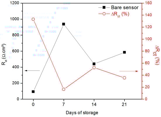 To evaluate the possibility of using this technology in practical applications, the stability of the sensor was examined by storing the device at room temperature in a dried and closed recipient during 21 days. EIS was performed every seven days after storage and the Rct values were simulated by modelling the equivalent circuit. Next, the sensor was exposed to 10−8 M glucose in order to evaluate its sensitivity. The results presented in Figure 9 reveal that the impedance of the bare sensor increased during the period of storage with a maximum value in the seventh day, perhaps due to a sensor-to-sensor variation and not specifically to the time of incubation. The higher was the basal Rct of the sensor, the lower was its capability to bind the target analyte was. The highest sensitivity was achieved with the fresh sensor, when the bare device presented an intrinsic Rct equal to 93.5 Ω·cm² and, after the exposure to glucose at 10−8 M, experienced an increase of 133.2%. This fact suggests that the storage influenced the performance of the sensor, probably as a consequence of the redox reactions that spontaneously takes place on the carbon electrode, favoring the development of oxides on its surface. Thus, the formed insulator layer can act as a barrier to the charge transfer phenomenon and make the sensor unable to recognize the glucose molecules. In this sense, other storage conditions should be tested in order to maintain reproducible the performance of the device.