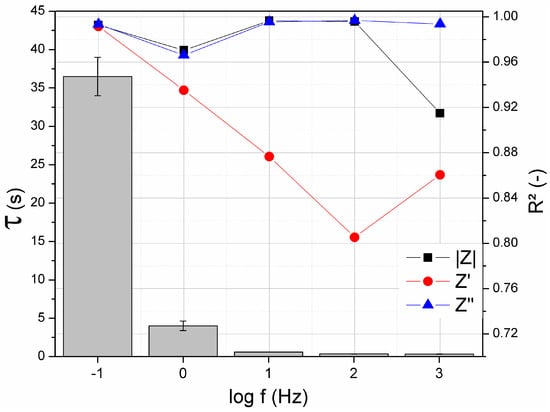 Considering the criterion of χ² < 10−3 as an indicative of the fitting quality [], it was possible to ensure that the proposed equivalent circuit was suitable to model the experimental data.