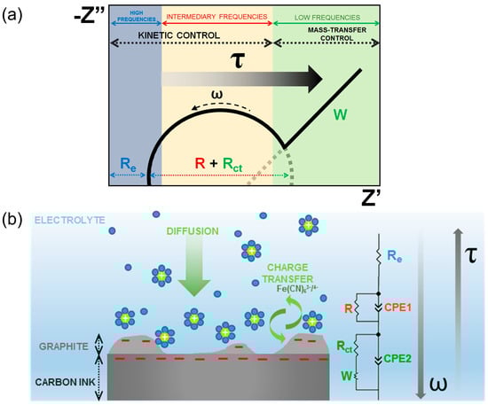 Obviously, the higher the frequency is, the lower is the time required to acquire the impedance data. It is well known that several phenomena interfere in the impedance spectrum at different frequency ranges, as illustrated in the scheme of Figure 11. At high frequencies, the impedance is strongly related to characteristics of the electrolyte, which is not representative of the analyte recognition. At very low frequencies, analysis can lead to the effect of diffusional mechanisms. For this reason, to avoid both non-representative effects of the detection of glucose, the analysis of EIS at 100 Hz could provide the best response of the sensor considering the great R² values from both |Z| and Z’’ as well as the corresponding low τ, which was equal to 4.0 ± 0.6 s.
