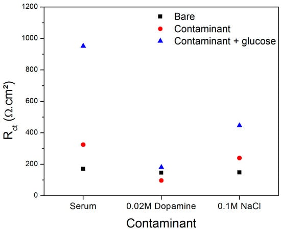 Figure 12 shows the Rct value of the bare sensor in absence/presence of each contaminant in a solution containing or not containing 10−8 M glucose. Despite the exposure of the sensor to the interfering species caused some variations on the impedance, a marked increase of Rct occurred when the sensor was kept in contact with the solutions containing both glucose and interfering species. The presence of 10−8 M glucose in the solutions containing animal serum, dopamine and NaCl generated an increase of Rct equal to 193.0%, 87.7% and 86.4%, respectively.