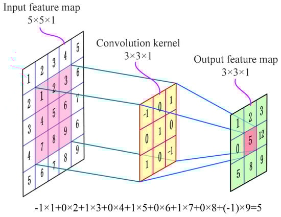 The convolutional layer is one of the most important core modules in CNN []. It contains multiple convolution kernels (also known as filters). The filter is usually a rectangular matrix, and each value of the matrix is a weight (also known as a characteristic value) learned from the input data []. Each filter has different weights. These weights are calculated automatically by an error back propagation algorithm []. In the convolutional layer, the input feature map is convolved with a bunch of learnable convolution kernels to generate many new feature maps as the input to the next layer []. The calculation method principle schematic diagram of a convolution operation is shown in Figure 2. In Figure 2, the left picture is an input feature map, the middle is a convolution kernel, and the right is an output feature map.