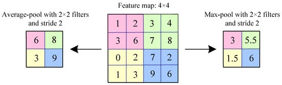 Different from the convolution operation, in Figure 3, the pooling operation generates a representative value to replace all elements in the pooling window. Pooling operations mainly include maximum pooling and average pooling [,]. In Figure 3, the middle graph is the raw feature map, the left is the average pooling operation, and the right is the maximum pooling operation. The maximum pooling (max-pooling) selects a maximum value as the representative value from all the elements in the corresponding area of the pooling window []. Average pooling calculates the average value from all the elements as the representative value in the corresponding area of the pooling window. Max-pooling is excellent at handling texture features, and average pooling is more sensitive to background information []. In CNN, the max-pooling is widely used in a pooling layer []. The mathematical expression of max-pooling [] is described as follows: