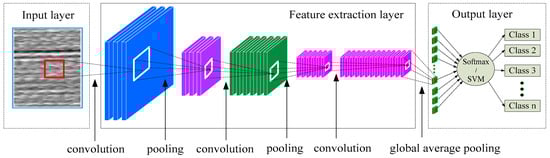 In the improved CNN-SVM algorithm, it is mainly composed of an input layer, a feature extraction layer, and a classification estimation output layer. The feature extraction layer is the core part of the CNN-SVM algorithm. It consists of multiple convolutional layers, activation layers, and pooling layers stacked in sequence. Different from a traditional CNN, the proposed method uses a combination of a 1 × 1 convolution layer [] and a global average pooling layer [] to replace the 2~3 layers of fully connected layers. A detailed structural design is shown in Figure 5.