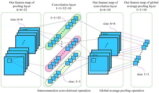 Secondly, the shape of 6 × 6 × 10 is converted into 1 × 1 × 10. In order to realize this goal, a global average pooling technology is applied. The 10 feature maps of 6 × 6 correspond to 10 global average pooling kernels. Each pooling kernel size of the global average pooling layer is 6 × 6, the stride is 6, and the padding mode is “Same”. The role of the global average pooling layer is to change only the size of feature map without changing its number of output channel []. The 36-pixel values of each 6 × 6 feature map are averaged to obtain a global average value. According to this method, 10 feature maps of 6 × 6 can obtain 10 output values of 1 × 1. Therefore, the final output feature map is 1 × 1 × 10, as shown in Figure 5.