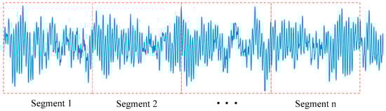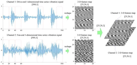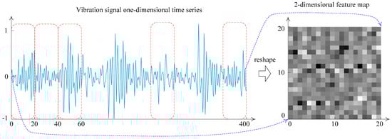 The input layer is used for receiving the raw fault monitoring data from the rotating machinery, and some necessary operations are conducted on the raw data such as data standardization and format normalization. The raw data need to be converted to the trainable type of CNN []. In general, the input data format of a CNN model is 2-D pixel grid data (such as image data) or 3-D data (such as a CT scan or color video data) [,]. In this paper, the one-dimensional time series fault vibration signal data of the rotating machinery can be transformed into a two-dimensional input feature map form by the data reconstruction method []. The data reshaping process is shown in Figure 6.