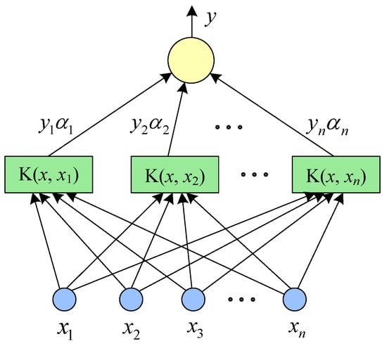 where w and b are optimization parameters, is a slack variable, and C is a penalty factor. By continuously adjusting w and b, the objective function is minimized. Finally, the maximum separation hyperplane is obtained []. Solving the dual problem of Equation (9) and selecting the suitable kernel function and the penalty factor C (C > 0), the separation hyperplane that solves the nonlinearity can be obtained as: