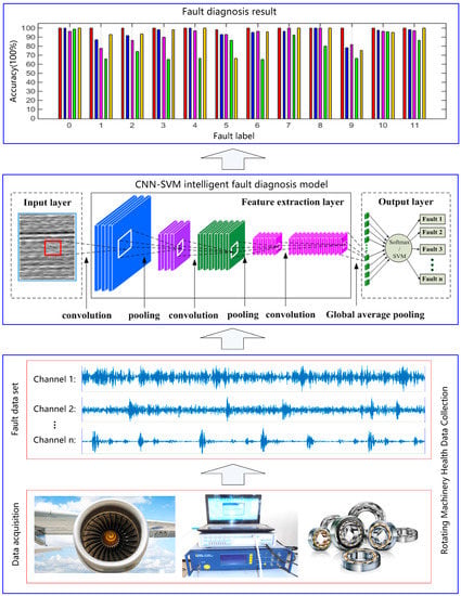In Figure 8, the application object of the proposed method includes aircraft engines, generators, electromotor, and other common rotating parts in machinery. The fault types contain the common faults in rotating machinery such as the mechanical wear, fracture, deformation, and rotor eccentricity imbalance, etc. The fault signal data include common monitoring signals such as vibration, noise, current, and pressure, etc. In Figure 8, there are three modules in the proposed CNN-SVM fault diagnosis framework. The lowest layer is the data acquisition module of the rotating machinery. The top layer is the resulting output module of the fault diagnosis. The middle layer is the CNN-SVM intelligent algorithm module. The proposed method can get rid of the dependence on manual feature extraction and can overcome the limitations of traditional methods relying on expert experience. The basic flow chart of the CNN-SVM intelligent fault diagnosis algorithm is shown in Figure 9.