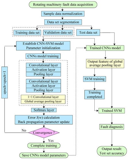 The flow chart of the CNN-SVM intelligent fault diagnosis algorithm.