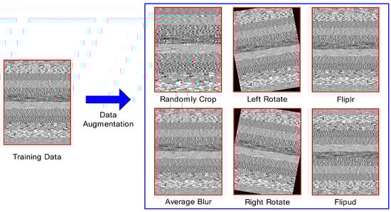 CNN is suitable for processing large data sample sets. The over-fitting problem is easily generated in a CNN when the training samples are insufficient []. The over-fitting problem will result in a good fitting performance of the trained model to the training dataset but a poor generalization ability to the new fault data []. Data augmentation technology is an effective method to solve the sample shortage in deep learning. It expands the original dataset and improves the generalization ability of the model by a series of small-scale random images transformations to the original feature image. It has been widely used in image recognition []. The common data augmentation operation includes random cropping, rotation, flipping, etc. For the one-dimensional time series vibration signal fault data of the rotating machinery, it can be reconstructed into a 2-D feature map firstly, and then, the data augmentation operations are applied according to the image processing method, as shown in Figure 10. In Figure 10, the left side is the original training data feature map. The right side is six data augmentation operations including random cropping, left-right flipping, left rotation, average blurring, up-down flipping, and right rotation of the original data.