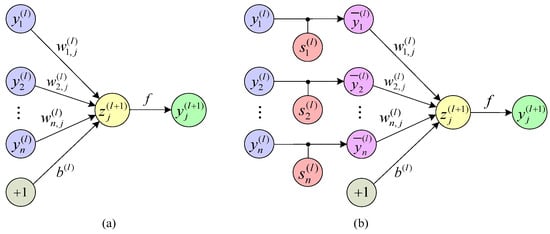 Fully connection layer is used in the classification stage in traditional CNN architecture. The main role is to further extract the features of the output data of CNN and to connect the feature extraction stages with the Softmax classifier [,]. In the traditional CNN, a fully connection layer is usually composed of 2~3 layers fully connected to a feedforward neural network. The final output feature map of a CNN is transformed into a one-dimensional array by a Flatten function. This one-dimensional array is thought as the input of the fully connection layer. Finally, the output of the fully connection layer is a one-dimensional vector. Each value of 1-D vector is a quantitative value of n classifications. In a fully connected network, all neurons between layers are interconnected, with the following definition: