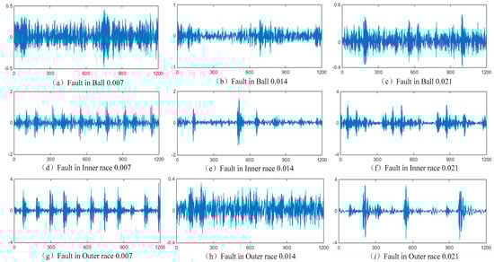 In recent years, with the gradual rise of machine learning and deep learning research, fault diagnosis methods based on artificial intelligence (AI) have gradually become a hot topic [,,,,]. Different from the traditional fault diagnosis methods based on signal processing technology, the intelligent diagnosis algorithm can automatically extract the useful representative features from monitoring data []. The traditional intelligent diagnosis method usually includes three steps: feature extraction, feature selection, and fault classification []. Feature extraction is to process and transform the raw data signals collected by the multiple sensors in the time domain, frequency domain, and time-frequency domain and to extract useful representative features for subsequent fault identification [,,,]. The commonly used feature extraction methods include wavelet transform (WT) [], spectral analysis (SA) [], empirical mode decomposition (EMD) [], and Fourier transform (FFT) []. Feature selection further filtrates and removes the low sensitivity and useless data from the extracted features. The common feature selection methods mainly include principal component analysis (PCA) [] and independent component analysis (ICA) []. Fault classification puts the selected features input into the fault classifier for pattern recognition and, finally, outputs the classification results through repeated iterative training [,,]. Back-propagation artificial neural network (BPNN) [], support vector machine (SVM) [,], and K-nearest neighbor (KNN) [] have become the most popular fault classifier in the past decade []. Through application and verification, the above three algorithms have a poor feature extraction ability due to their shallow network structure, and it is difficult to be applied to other devices in the context of the big data []. At present, some scholars usually combine manual feature extraction with shallow machine learning algorithms to perform an intelligent fault diagnosis [,,,].