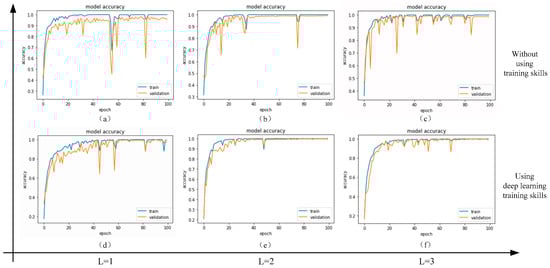 It can be obviously seen from Table 10 and Figure 17 that the two-layer CNN model using the deep learning training skills has the best performance and that the test accuracy is up to 98.99%. The performance of the one-layer CNN model is the worst, and the feature extraction ability is insufficient due to the simple structure. In this experiment, as the sample quantity of the training dataset is less, the model using the three-layer CNN is worse than the two-layer CNN model and easily causes a gradient disappearance and over-fitting of the deep convolution network structure. In addition, the training time and test time of the multilayer model structure is longer than the simple model because the model parameters increase as the number of CNN layers increase. In Figure 17, the dark blue curve represents the accuracy of the training dataset and the orange curve represents the accuracy of the validation dataset. It can be seen from the Figure 17a–c that the validation dataset accuracy curve is lower than the training dataset accuracy curve, which shows that the CNN model has generated over-fitting. Comparing Figure 17a–c with Figure 17d–f, it can be seen that the data augmentation and dropout training skills can effectively reduce the over-fitting of the model and can also improve the accuracy of the model in a small range.