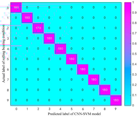 In Figure 18, the abscissa axis of the multi-class confusion matrix represents the predicted category label of the bearing condition and the ordinate axis represents the actual category label of the bearing condition. The sample number of test datasets for each type of bearing state is 180, and there are 10 types of bearing conditions, as shown in Table 4. The elements on the main diagonal of the multi-class confusion matrix represent the sample number of the correct classification of each bearing health condition. In Figure 18, each column quantifies the precision rate information. Each row quantifies the recall rate information. It can be obviously seen from Figure 18 that the lowest diagnosis result happens in condition 2. Only one of the 1800 test samples on the test set is misclassified by CNN-SVM prediction. The actual label of the misclassified sample is condition 2: Ball (Diameter: 0.014, Depth: 0.011), the predicted category by CNN-SVM model is fault condition 8: Outer Raceway (Diameter: 0.014, Depth: 0.011). Therefore, the fault severity level of both the predicted category and the actual category is the same; only the location where the fault occurs is confused. By checking the computer calculation result data, it can be known that the misclassification occurs in the 0-horsepower working condition. From Figure 18, the diagnosis accuracy of other types of fault is 100%. Especially, the diagnostic accuracy of all incipient micro-faults (condition 1, condition 4, and condition 7) is 100%. The comprehensive fault recognition rate is up to 99.94%. The experimental results show that the proposed CNN-SVM algorithm has a superior recognition ability and a high diagnostic accuracy for incipient faults of rolling bearings.