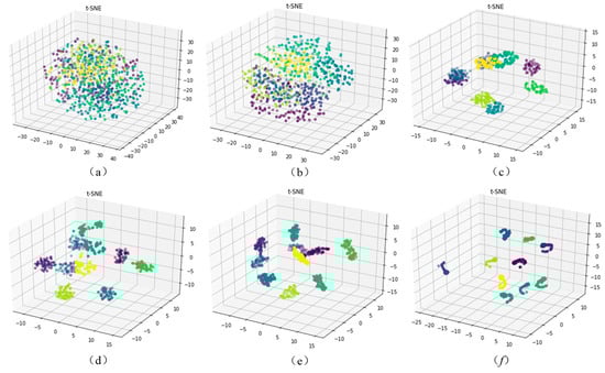 Scatter plots of the feature visualization under test dataset by t-distributed stochastic neighbor embedding (t-SNE): (a) The feature distribution of raw data, (b) the feature distribution of convolutional layer 1, (c) the feature distribution of convolutional layer 2, (d) the feature distribution of convolutional layer 3, (e) the feature distribution of the global average pooling layer, and (f) the feature distribution of the Softmax output layer.
