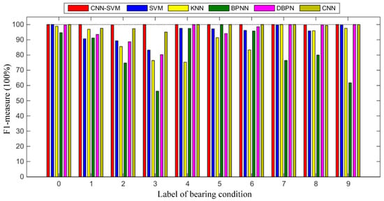 In order to demonstrate the superiority of the proposed CNN-SVM method, four other mainstream traditional intelligent methods are also used to diagnose the same fault dataset (as shown in Table 3) for comparison, including BP neural network (BPNN), SVM, KNN, and deep BP neural network (DBPN). In the traditional intelligent fault diagnosis methods, the manual feature extraction of a raw dataset is conducted firstly. Then, the extracted features are input into the intelligent diagnosis algorithm to complete the classification prediction []. Statistical features in the time domain and frequency domain are used in References [,,]. Reference [] extracted 14 features from raw data by using 14 feature extraction operators, including 10 time-domain features and 4 frequency-domain features; the detailed parameters are listed in Table 15 []. This paper is based on the 14 feature extraction operators to calculate the 14 statistical features of each bearing fault sample. Then, the extracted 14 features are input into SVM, KNN, and BPNN for a fault diagnosis. The experimental results of the precision rate and the recall rate of the six methods are listed in Table 16. Figure 20 shows that the six methods correspond to the F1-measure values (Percentage form).