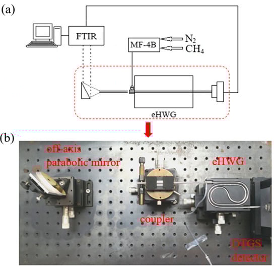 (a) Diagram of the sensing system. (b) Picture of light coupling, gas let in at the coupling end, gas let out at the distal end, and the detector for the eHWG.