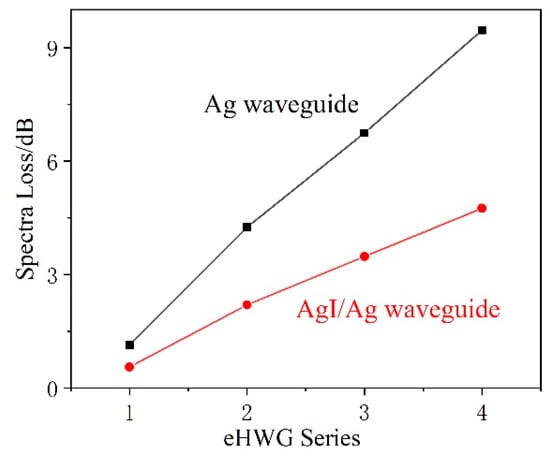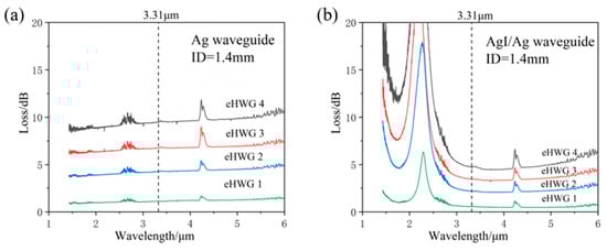 The Ag and AgI/Ag waveguides were fabricated and were curved into the substrates. Figure 4a,b present the measured loss spectra of the Ag and AgI/Ag waveguides in four kinds of eHWGs. It can be seen that the eHWG with the Ag waveguide had a flat loss property in the near and mid-IR regions. The eHWG with the AgI/Ag waveguide had an interference peak due to the transparent AgI film on the Ag layer. The small peaks at 4.2 μm were due to the absorption of CO2 gas in the air. The impact of this can be ignored in the context of this research. It can also be seen that the longer waveguide or sharper bending waveguide had higher loss. Figure 5 shows the spectra losses for the eHWGs. It is obvious that the eHWG with the Ag waveguides had higher loss than the eHWG with AgI/Ag waveguides. Furthermore, compared to the rapid loss increase of the Ag waveguides in eHWG-1 to -4, a slow growth of loss can be seen for the eHWG with the AgI/Ag waveguides. This is the merit of using AgI/Ag waveguides over Ag waveguides.