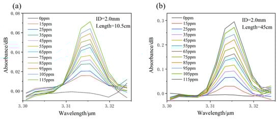 The background of the system was firstly measured, as shown in Figure 3, after a nitrogen gas purge in the waveguide. Then, methane gas with various concentrations flowed into the waveguide cell. The absorption was measured and the typical measured results for eHWG-1 and -4 are shown in Figure 7. The absorbance was recorded as the peak value of the absorption in the wavelength range of 3.305–3.322 μm. The absorbance became stronger with the increase in the waveguide length, as well as with the increase in the methane gas concentration.