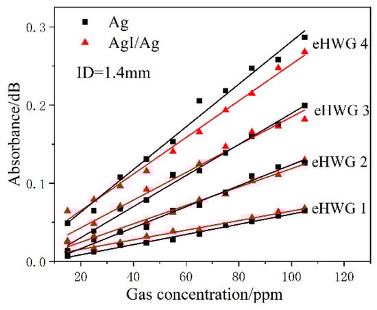 Eight groups of data were measured using four eHWGs with Ag or AgI/Ag waveguides with an ID of 1.4 mm. Figure 8 shows the absorbance versus concentration. eHWG-4 showed the fastest absorbance increase in concentration compared to eHWGs-1, -2, and -3, because eHWG-4 had the longest waveguide cell. For the same eHWG with an Ag or AgI/Ag waveguide, a similar absorbance increase was observed. This indicates that they had the same sensitivity due to their having the same waveguide length. We note that the eHWG with an Ag waveguide had a slightly higher sensitivity (larger slope) compared to the AgI/Ag waveguide. This might be caused by the multimode delivery in the waveguide. More modes were excited in the Ag waveguide than in the AgI/Ag waveguide. The effective optical length [] of the Ag waveguide was a little longer than that of the AgI/Ag waveguide. However, the eHWG with an AgI/Ag waveguide had a lower LOD due to its low loss, as we will see in the following discussion.