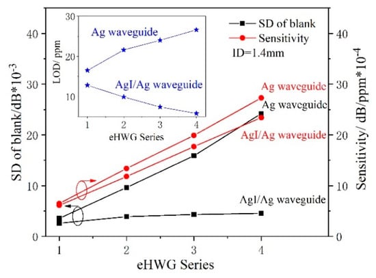 Figure 9 shows several important results according to the data in Table 2. It can be seen that the sensitivity was almost the same for the same eHWG regardless of whether it had an Ag or AgI/Ag waveguide (red lines). A rapid increase in the SD of blank was observed from eHWG-1 to -4 when they were embedded with Ag waveguides. The increase in the SD of blank was much slower when embedded with AgI/Ag waveguides (black lines). Consequently, the LOD decreased from eHWG-1 to -4 with the AgI/Ag waveguide because of longer waveguide cell, as shown in the inset in Figure 9. On the other hand, the LOD increased from eHWG-1 to -4 with Ag waveguides because the high loss caused low SNR and a large SD of blank, which overwhelmed the sensitivity increase of the long waveguide cell. The same result is found in the literature [] for iHWG with a metallic channel. Based on the results, the AgI/Ag waveguide was a reasonable choice in order to seek to ensure a low LOD.