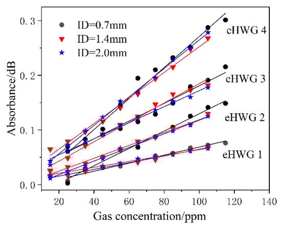 It was shown above that choosing the AgI/Ag waveguide has advantages over the Ag waveguide at the LOD. The performance of the eHWG with AgI/Ag waveguides of various IDs were also experimentally discussed. Twelve groups of data (including four groups of data in Figure 8) were measured for four eHWGs with AgI/Ag waveguides with IDs of 0.7 mm, 1.4 mm, and 2.0 mm. The absorbance versus concentration is shown in Figure 10. Similar results were obtained, showing that the eHWGs with longer waveguides had higher sensitivity. Concerning the sensitivity of the same eHWG with waveguides with different IDs, we concluded that the inner diameter had no obvious influence on the sensitivity. Although a slight difference in sensitivity can be observed in Figure 10 for waveguides with various IDs in the same eHWG, this might have been caused by measuring error, or the different mode structures and coupling conditions for the waveguides.