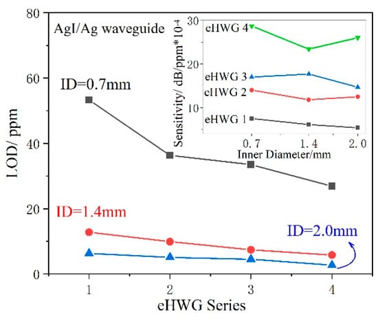 Table 3 presents a summary of the performance of the eHWGs with AgI/Ag waveguides with various IDs. Figure 11 presents several important results drawn from the data in Table 3. It can be seen in the inset of Figure 11 that the sensitivity increased from eHWG-1 to −4 due to the long waveguide, while no obvious influence of the ID on sensitivity can be seen for the same eHWG.