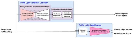 The TL candidate region is extracted from the RGB color image through the binary semantic segmentation network and the candidate region detection. The TL candidate region is resized into 12 × 36 size through the warping layer, and is classified into seven classes through the TL classification network. The class with the highest confidence score is finally selected. Except for the background class, the TL recognition outputs the type of TL, bounding box coordinates, and confidence score.