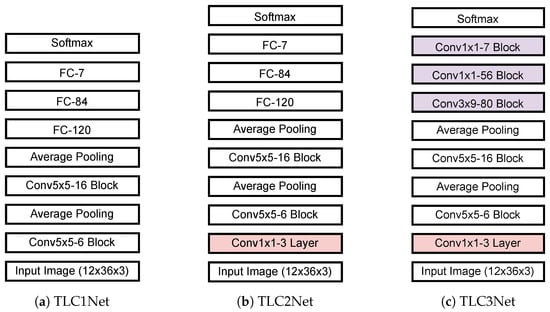 54]. In addition, batch normalization is applied between the convolution layer and the activation layer. Average pooling with factor 2 is applied after the first and second convolution blocks. The second proposed classification network, TLC2Net, is designed by adding a convolution layer with three filters of (1 × 1) to TLC1Net, as shown in