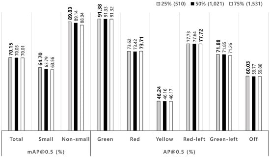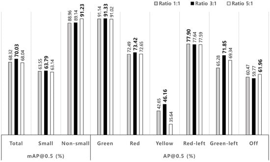 For the evaluation of performance variations by ratios of training to test datasets, the selected ratios are 1:1, 3:1, and 5:1. Note that the total dataset is composed of 8144 images with 17,102 traffic lights from the Bosch TL dataset. In case of the ratio of 1:1, training and test datasets are composed of 4072 and 4072 images, respectively. For the ratios of 3:1 and 5:1, ’6102 and 2042’ and ’6783 and 1361’ images. For each simulation, 50% images in test dataset are randomly selected and swapped with training images. For each ratio of training to test dataset, the simulations are conducted by five times with the different swapped images. Average recognition performances are provided in