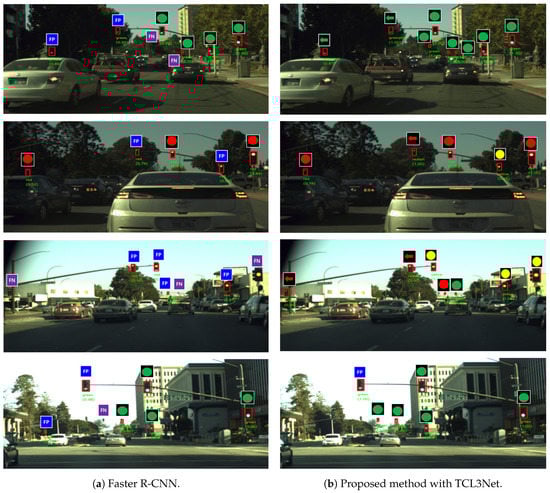 Figure 5 shows the TL recognition examples of the proposed TL recognition method with the BSSNet-full-size and TLC3Net. Faster R-CNN examples are also shown. A true positive is indicated by the corresponding six types of TL symbol. False positive and false negative cases are indicated by a blue rectangle with FP and a purple rectangle with FN, respectively. As shown in