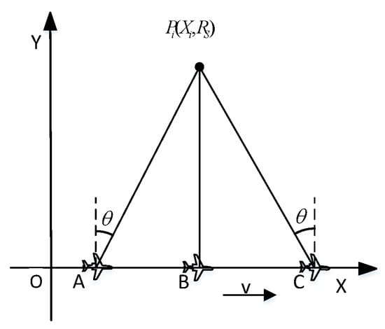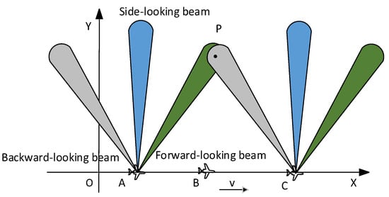 As shown in Figure 3, the speed of the carrier is and the wavelength is . Taking the three beams as an example, in data collecting, the echo data of target from forward-looking beam is firstly obtained. When the carrier is located at , the forward-looking beam center points to the target . At this time, the squint angle is , and the beam-width of forward-looking beam is . When is small, the Doppler bandwidth is approximately